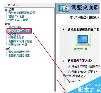2、在NVIDIA控制面板中點擊左側列表中的“調整桌面顏色設置”然后在右側就能調節亮度了。