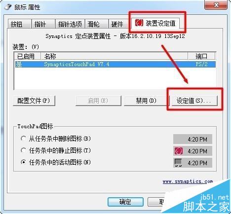 3、來到了“鼠標(biāo)屬性”,點擊上欄的“裝置設(shè)定值”選項卡,再點擊“設(shè)定值”