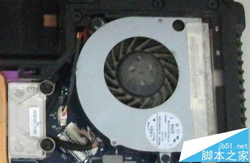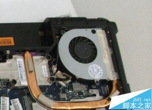 4、找到散熱扇,看到了嗎?是不是很多灰,這些灰塵會嚴(yán)重阻礙風(fēng)扇的散熱,導(dǎo)致筆記本溫度過高而死機。。