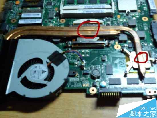 紅圈位置是拆掉散熱管后涂導熱硅脂的地方。