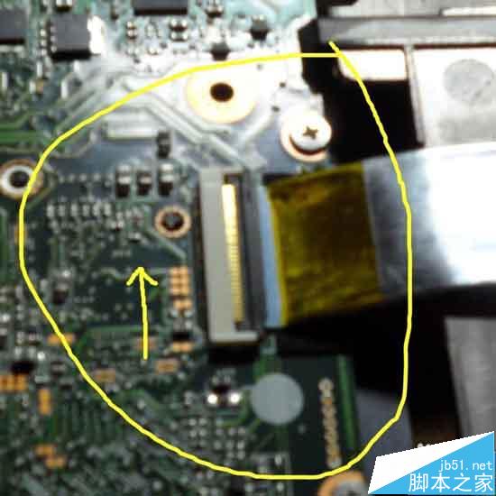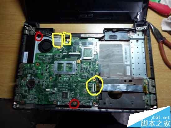 拆掉后就露出主板,兩個紅色部分是固定主板的兩個螺絲,右下黃色部分是連接右邊的USB和音頻輸出排線,上面黃色部分包含了屏幕排線和音響線,需都拆下。