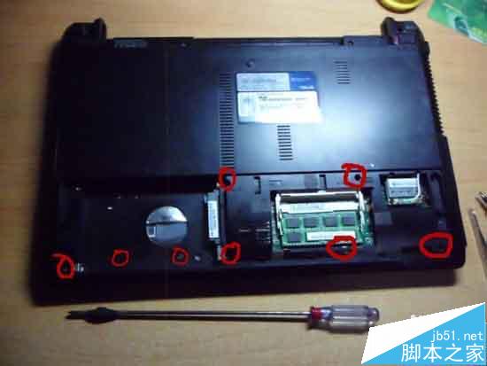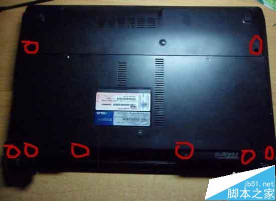 看看筆記本背面,如圖位置,一共八顆螺絲,全部卸掉。