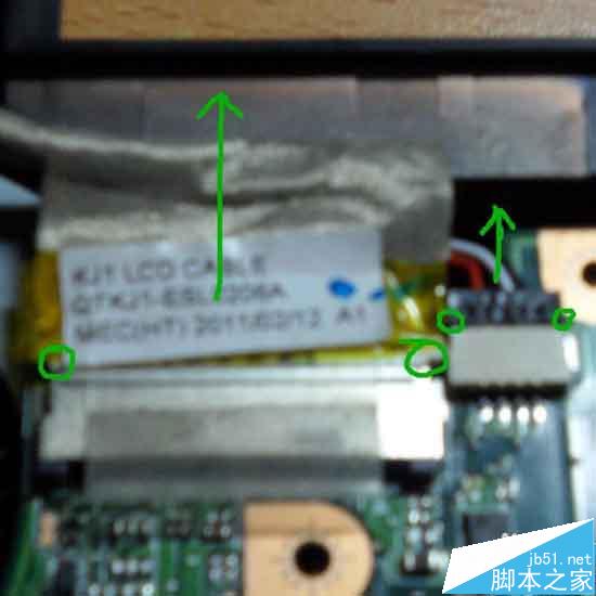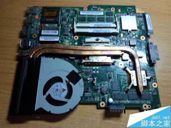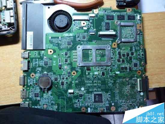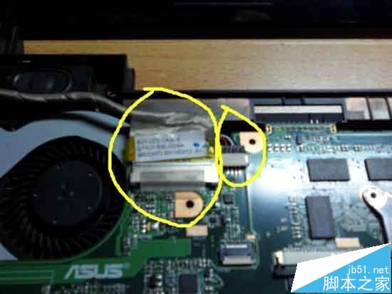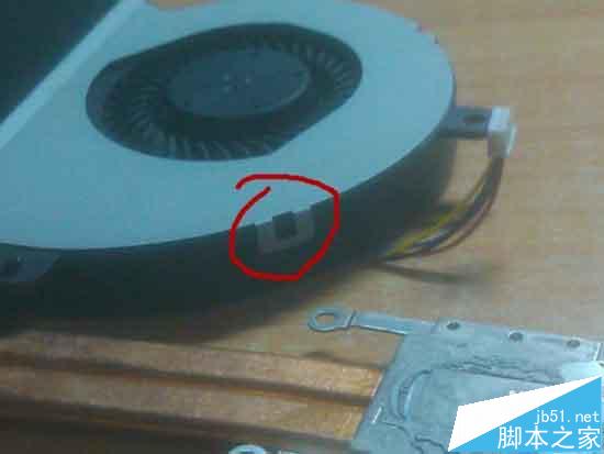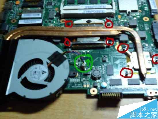 拆掉七個螺絲,向上拔出風扇的排線(綠圈),要小心啊,用力小了,拔不出,用力大了,會出大事。然后就看到了處理器和顯卡,上面的是處理器,下面是顯卡。GF108核心,周圍是四顆現代1.1NS的DDR3顯存顆粒,背面還有四顆。