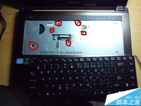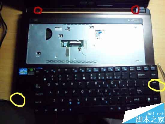 接下來轉到正面,鍵盤部分。鍵盤上部分共有4個卡口,用一字螺絲刀反方向,輕輕的將鍵盤卡口逐一翹起。