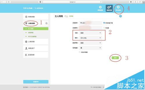 3、點擊左側“無線設置”,將右側的“模式”改成“11n only”,點擊“保存”,最后點擊右上角的“安全退出”。