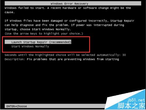 2、電腦將顯示"Launch Startup Repair (Recommended),啟動(dòng)啟動(dòng)修復(fù)(推薦)"錯(cuò)誤并重啟,無法正常進(jìn)入操作系統(tǒng)。