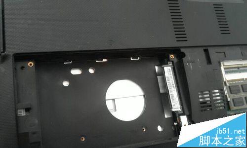11、把電腦翻過來背面朝上,在剛才抽走的光驅這個框架這里,有一個很細小的螺絲,把它也擰下來。
