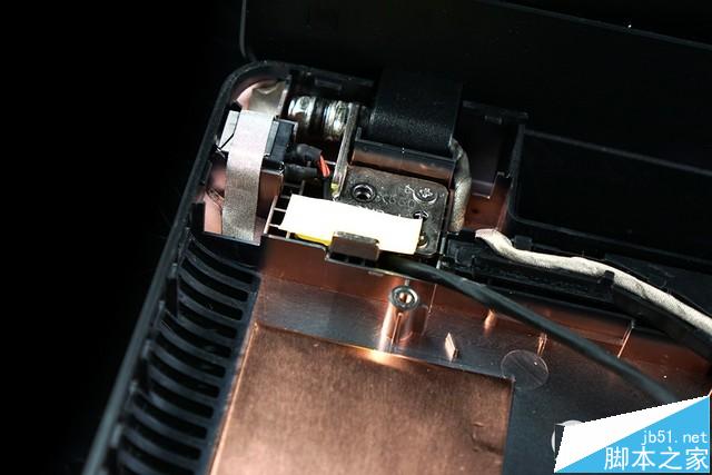 在簡單的拆卸底殼之后,我們可以仔細觀摩華碩FX50整體的內部構造。總的來說,華碩FX50機身內部結構還是比較寬裕的,主板、硬盤位等部件基本上都分布的較為均勻。散熱模塊被設計在屏幕左轉軸下面,這是目前筆記本比較流行的設計。