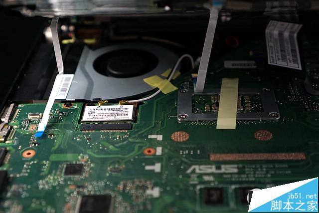 華碩FX50拆除底殼后剩余的整體,各個零部件的布局還是比較清晰明朗的。主板面積較大,并配有大號散熱風扇,內部還設計有DVD光驅位。簡單來說,該機的整體內部結構比較簡單,沒有太多復雜的連接設計,也沒有復雜的擴展設備
