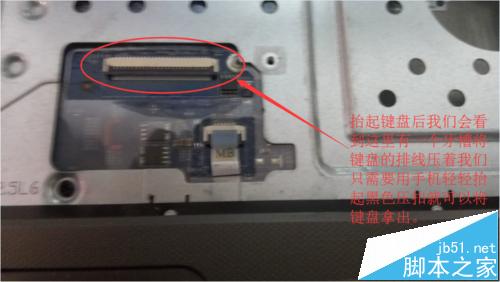 5、卡扣全部翹起口我們稍微抬起鍵盤會(huì)看到鍵盤的排線,因?yàn)橐粋€(gè)人操作圖片太難拍攝所以單獨(dú)一步描述,抬起鍵盤上半部分往鍵盤下面看會(huì)看到亞盤壓著鍵盤的排線我們把亞盤的下方黑色壓扣抬起就可以輕松的拿下鍵盤了拿下后放在一邊,這一步一定要注意有些保存不當(dāng)?shù)墓P記本這個(gè)地方很脆弱要輕輕抬起壓塊,否則以后就只能使用外置鍵盤了。
