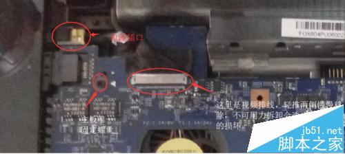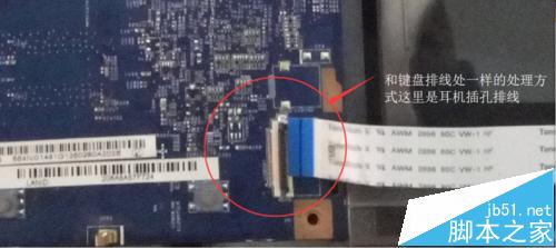 第二部分圖四所示我們將這個(gè)排線和鍵盤排線拆除一樣拿下來(lái),這是耳機(jī)插孔的排線。完成這兩部分的拆除我們就可以從右側(cè)輕輕抬起主板了,然后拿下放在一邊。