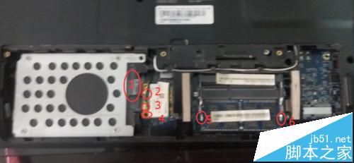 3、這就是我們拿下那個(gè)獨(dú)立蓋子后的東西,圖一中紅圈1為硬盤提手,我們將固定鍵盤的螺絲擰掉后提起這里向圖中左側(cè)拉動(dòng)硬盤就取下了,紅圈2和3分別是wifi模塊的兩個(gè)導(dǎo)線跟按扣的構(gòu)造差不多拔下(一定要注意用力方向),紅圈4是固定wifi模塊的螺絲擰下來(lái),擰下這個(gè)螺絲后wifi模塊就自動(dòng)翹起我們向左拿出就可以了,紅圈5和6分別是固定內(nèi)存的卡扣,我們可以看到這個(gè)筆記本有兩個(gè)內(nèi)存插槽也就是可以再增加一根內(nèi)存條,將5向左掰6向右掰內(nèi)存就會(huì)順勢(shì)抬起這時(shí)我們只需要向外拔出內(nèi)存就可以了。圖四就是拿出所有部件后這一塊的樣子。