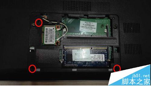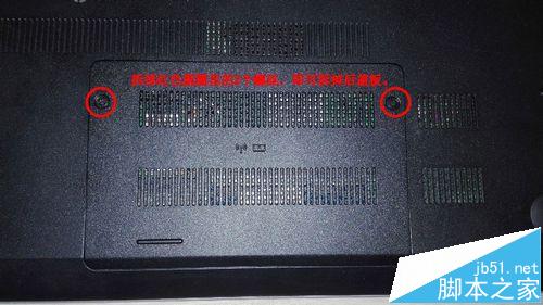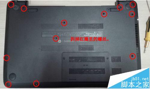 1、首先把電腦的電池和電源拿開之后,從底部一塊小蓋板開始拆解。蓋板有2顆螺(圖中紅圈)釘固定,擰開之后拔下來就行了。