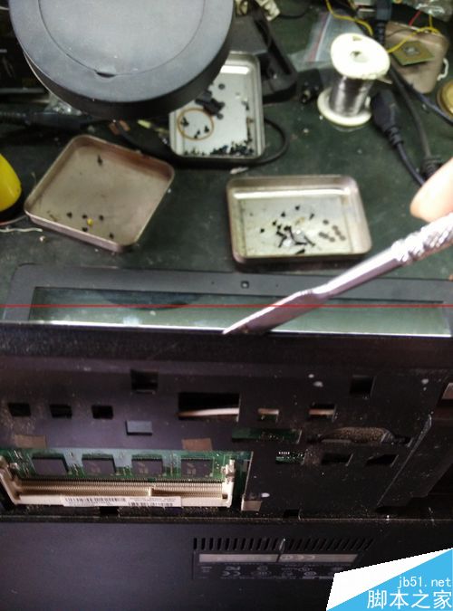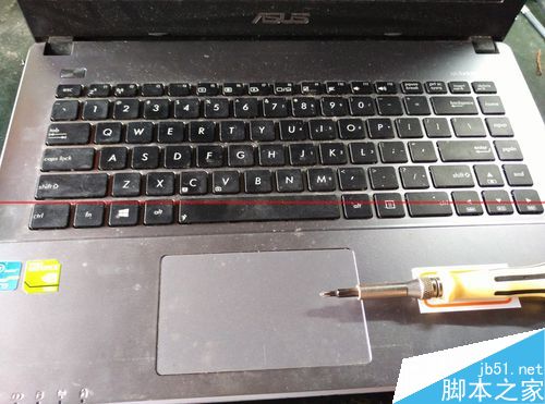 7、這臺機子的鍵盤是和C殼連在一起的,所以我們可以直接拆C殼。這個時候需要用到撬棒,沒有的朋友可以用指甲代替,需要指甲比較長。注意用力需要均勻,而且不要強行撬開。如果感覺撬不開的朋友可以看一下D殼上的螺絲是否全部擰開了。