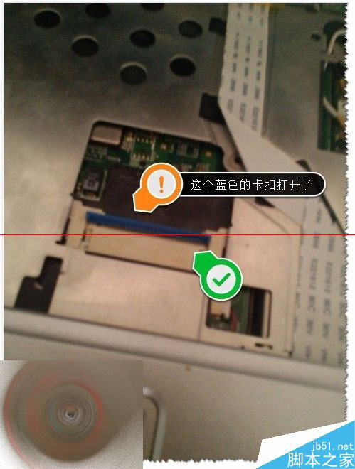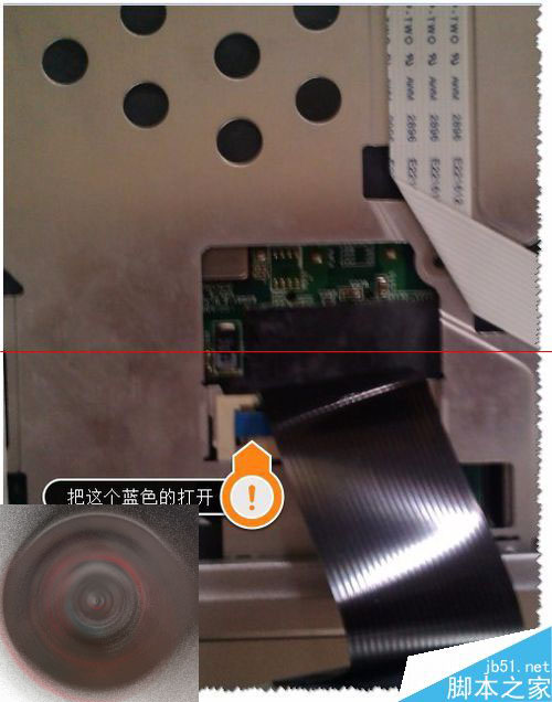 6、拆卸完成了,那么如何安裝回去呢?首先打開藍(lán)色卡扣,連接線按原來(lái)連接線的折痕方向安裝(注意方向不要裝反了)。如圖