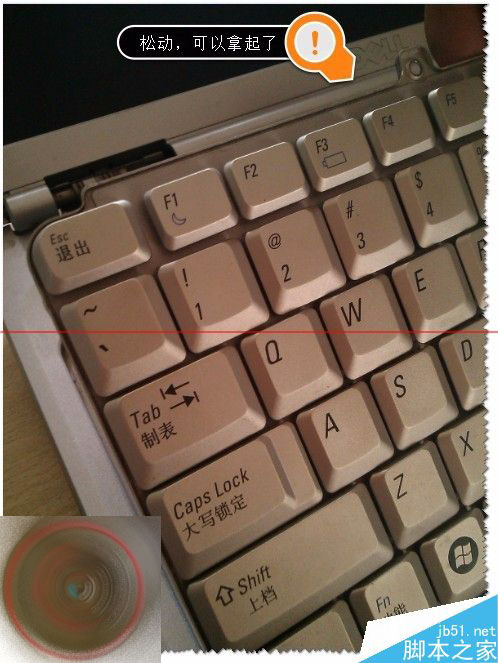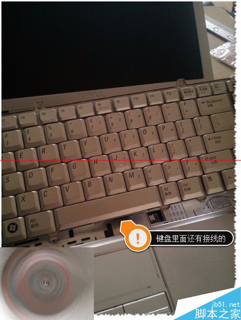 4、這時(shí)鍵盤是松了,但是還是不可以全部拿起來(lái)的。不能太用勁了,注意鍵盤里面還是連接線的哦!!!可以把鍵盤輕輕翻過(guò)來(lái),就可以看到連接線了。如圖