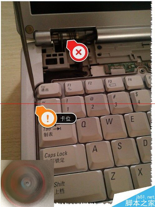 5、注意:要拆鍵盤一定要把藍(lán)色卡扣打開,才把黑色的連接線拔出來(lái)。如圖
