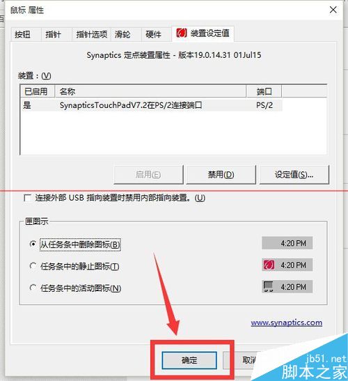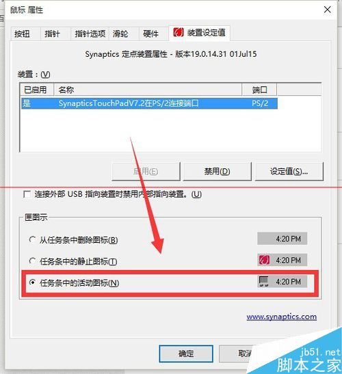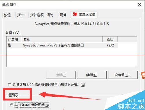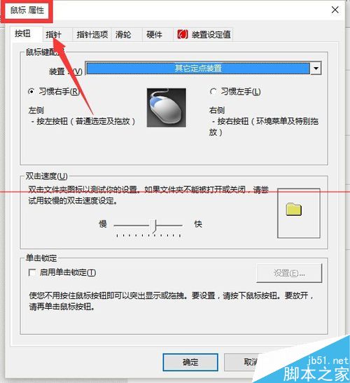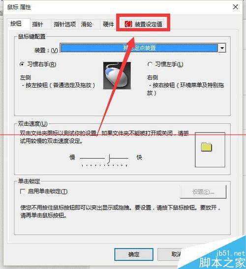 2、在【鼠標屬性】面板,找到【裝置設定值】選項,如圖