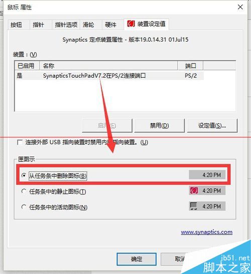 3、在【裝置設定值】選項下找到【匣圖示】選項,然后將【匣圖示】里面的【任務條中活動的圖示】更改為【從任務條中刪除圖標】,然后點擊【確定】,如圖