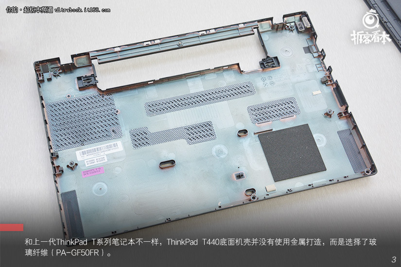 和上一代ThinkPad T系列筆記本不一樣,ThinkPad T440底面機殼并沒有使用金屬打造,而是選擇了玻璃纖維(PA-GF50FR)