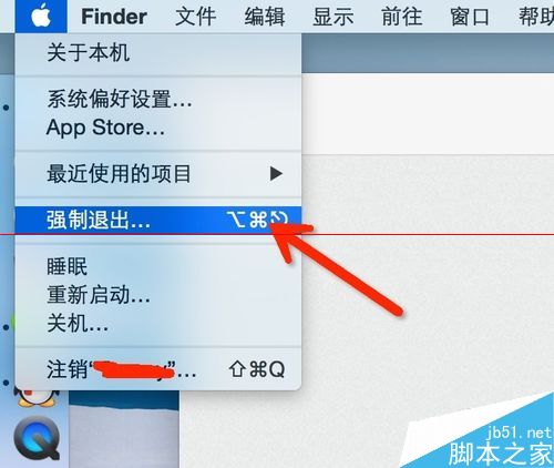 3、找到左上角的小蘋果。點擊進入,找到——[強制退出]命令。點擊進入