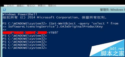 4、輸入(Get-WmiObject -query ‘select * fromSoftwareLicensingService’).OA3xOriginalProductKey可以直接復制,復制后,直接在下面頁面右鍵單擊一次,就會復制到那里了,再按回車鍵,密鑰出現了,如果不可以,重復復制一次再回車