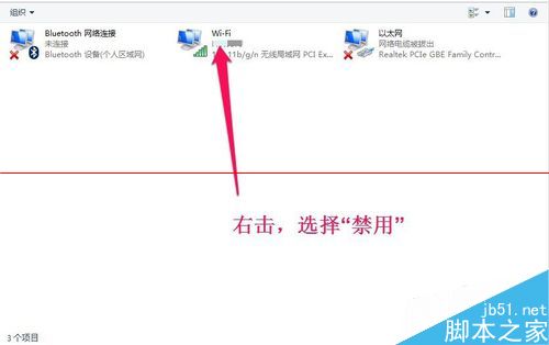 3、右擊中間的WiFi圖標,選擇“禁用”