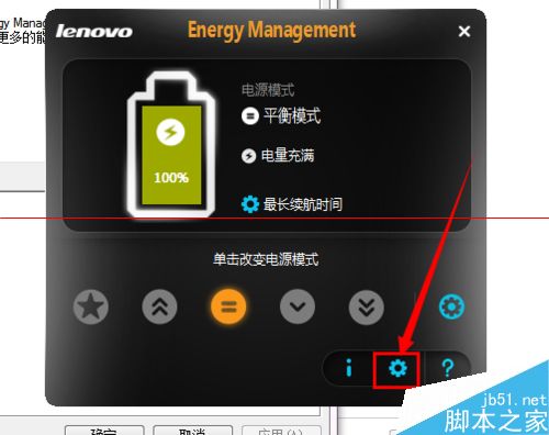 7、接下來(lái),在打開的聯(lián)想電源管理軟件中點(diǎn)擊如下圖所示位置的設(shè)置按鈕,打開設(shè)置??赡苡械耐瑢W(xué)的電腦系統(tǒng)中的聯(lián)想電源管理軟件和下圖所示的不一樣,但是原理基本上是一致的。