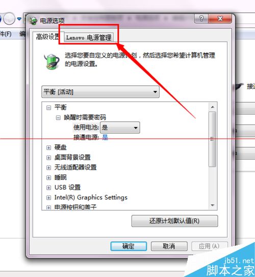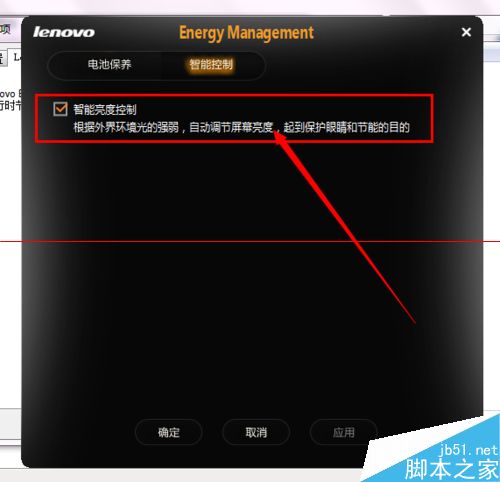 5、在接下來(lái)彈出的界面中,我們的直接點(diǎn)擊右側(cè)的“Lenovo電源管理”選項(xiàng),當(dāng)然前提是你安裝了聯(lián)想電源管理軟件,但是如果你不安裝該軟件的話是不會(huì)實(shí)現(xiàn)亮度隨光線的改變而改變這個(gè)功能的。