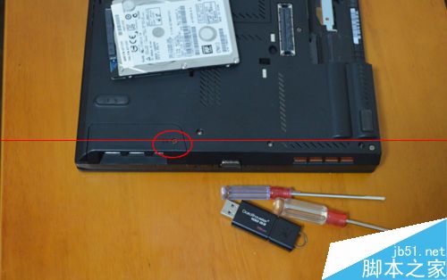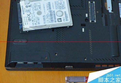 3、T430的原硬盤在這個位置,如圖,我們只需用螺絲刀拆下這顆螺絲,拿下外盒即可(螺絲是和部件緊密連接的,所以螺絲松掉后可以慢慢活動機殼拿下),把途中唯一畫圈的螺絲擰松(硬盤蓋上的),注意:螺絲取不下來。