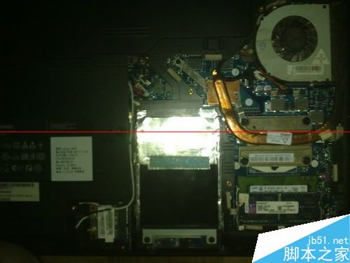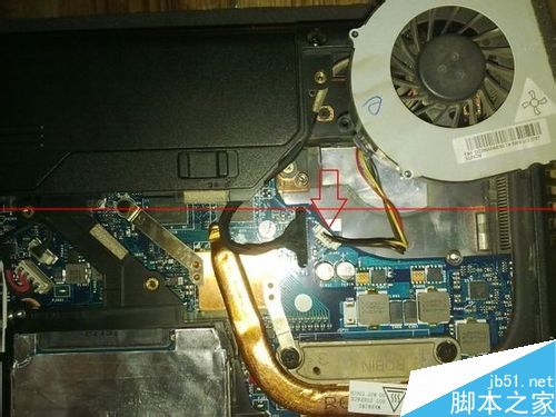6、擰開5個鏍絲后可將CPU、顯卡的散熱片拆開,拆開后可涂上導熱硅脂以提高其散熱效果(注:若沒有導熱硅脂切不可隨意拆卸此散熱片),圖中標有箭頭處為導熱硅脂,圓圈處為CPU和顯卡。