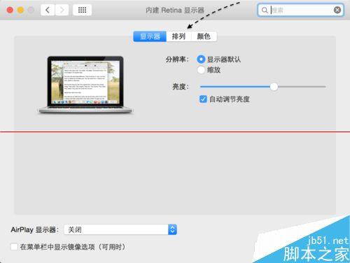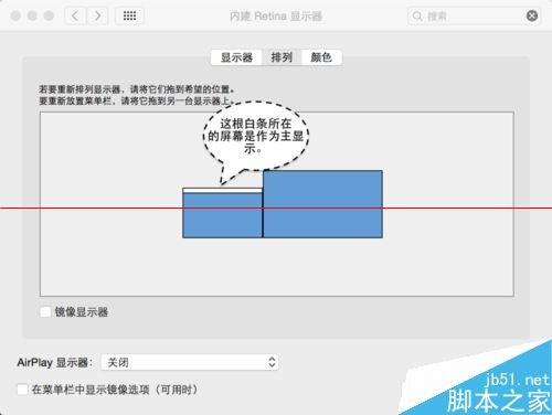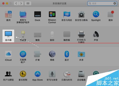 3、當我們把 Mac 與顯示器連接起來以后,接下為我們還需要設置顯示方式。顯示方式有二種,一是鏡像顯示(二個顯示屏上顯示一樣的內容);二是分屏擴展顯示(二個顯示屏幕上顯示不同的內容)。我們可以在 Mac 上的系統偏好設置里打開“顯示器”選項,如圖所示