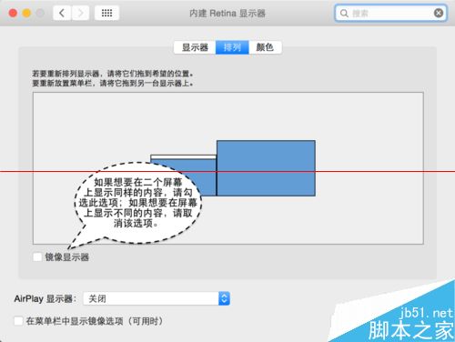 5、如果你想在二個屏幕上顯示同樣的內容,請勾選“鏡像顯示器”這個選項; 如果想在屏幕上顯示分別顯示不同的內容,請取消此選項。
