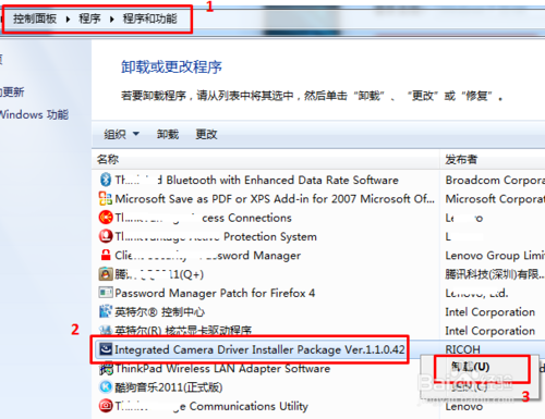 如果系統使用的是GHOST克隆形式的安裝方式,則自動安裝的攝像頭驅動程序可能是錯誤的?;蛘唠m然不是GHOST安裝,但也可能安裝了錯誤的攝像頭驅動。這種情況下,需要完全卸載原有已安裝的攝像頭驅動,并重新啟動電腦后再嘗試安裝。 操作步驟:依次單擊“開始”、“所有程序”、“控制面板”、“程序”、“卸載程序”,在程序列表中選擇已安裝的攝像頭驅動,比如下圖中的“Integrated Camera Driver Intaller……”,右鍵單擊并選擇“卸載”,然后按照提示“完全卸載”即可: