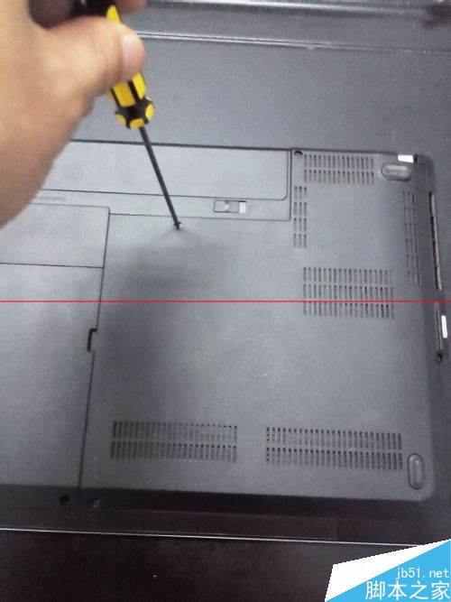 3、筆記本關(guān)機(jī)后地面朝上放置在桌子上,用螺絲刀依次卸下固態(tài)硬盤所在區(qū)域的后蓋螺絲。