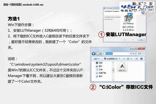 方法1 Win下操作步驟: 1、安裝LUTManager(32和64均可用); 2、將下載的ICC文件放入C盤根目錄下的任意文件夾下,最好是不經常修改的,我新建了一個"Color”的文件夾。說明:"C:/windows/system32/spool/drivers/color”是Win7的默認ICC文件夾,不過這個文件夾在LUTManager下看不到,所以建議大家在C盤根目錄新建了一個Color文件夾。
