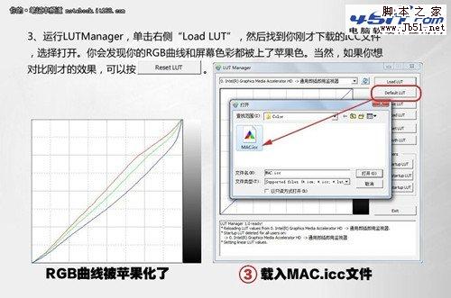 運行LUTManager,單擊右側“Load LUT”,然后找到你剛才下載的ICC文件,選擇打開。你會發現你的RGB曲線和屏幕色彩都被上了蘋果色。當然,如果你想對比剛才的效果,可以按ResetLUT。