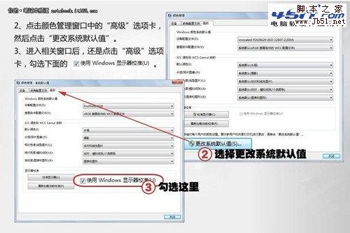 2、點擊顏色管理窗口中的“高級”選項卡,然后點擊“更改系統默認值”。 3、進入相關窗口后,還是點擊“高級”選項卡,勾選下那個Windows顯示器校準選項。