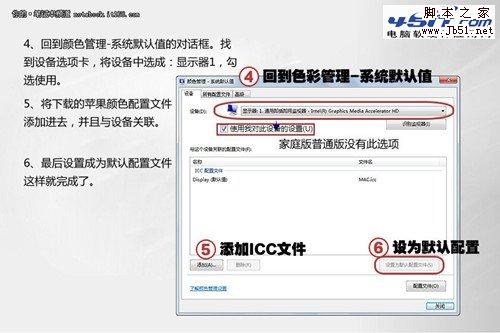 4、回到顏色管理-系統默認值的對話框。找到設備選項卡,將設備中選成:顯示器1,勾選使用。 5、將下載的蘋果顏色配置文件添加進去,并且與設備關聯。 6、最后設置成為默認配置文件這樣就完成了。