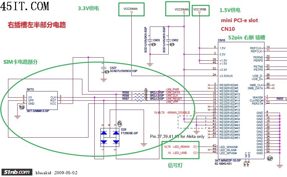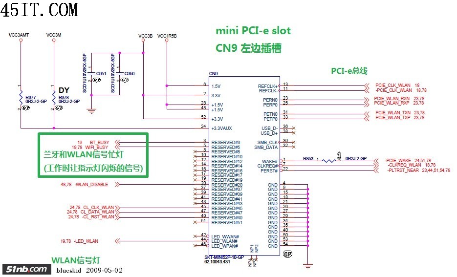 左邊電路沒有問題,不會缺零件,這里貼上以求完整性。這個槽在電路上編號CN9,主要為WLAN服務,一些特殊的引腳用途我專門做了標注。包括WLAN信號(LED,WLAN和BT工作忙的信號等等。