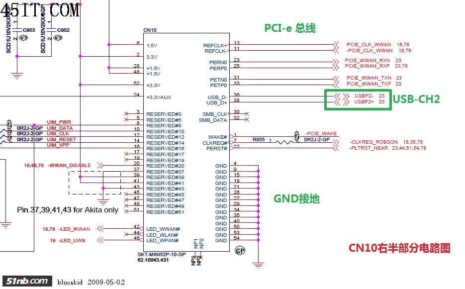 3、USB:mini-PCIe是聯合使用了PCIe總線和USB總線的 (MiniCard is used to implement both the 1x PCI Express Bus interface and a USB 2.0 interface,所以要看看USB的幾個pin是否有連接。 38USB_D 36USB_D-