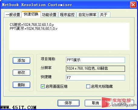 切換到“快速切換”窗口,點(diǎn)擊“分辨率”右邊的灰色方框,在彈出窗口中選擇一個(gè)分辨率(如1024×768),點(diǎn)擊“確定”后,在“項(xiàng)目簡(jiǎn)稱”右邊輸入一個(gè)名稱,例如玩CS游戲或PPT演示。為了讓顯示輸出擁有完整的屏幕,必須點(diǎn)尋啟用畫面壓縮”,如果設(shè)置多個(gè)應(yīng)用分辨率,建議為每個(gè)分辨率設(shè)置切換熱鍵,設(shè)置后點(diǎn)擊“添加”按鈕即可(如圖4)。