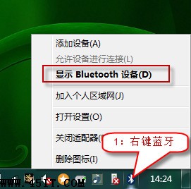 1:右鍵右下角的藍(lán)牙圖標(biāo)單擊顯示Bluetooth設(shè)備