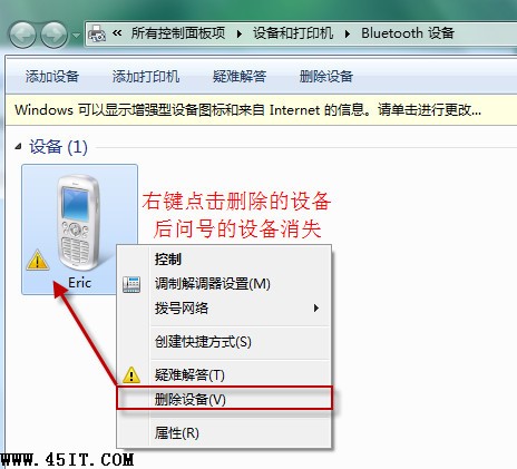 2:右鍵配對過的藍(lán)牙設(shè)備后單擊刪除設(shè)備,Bluetooth外圍設(shè)備消失。