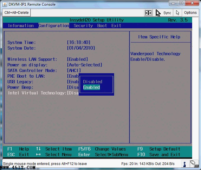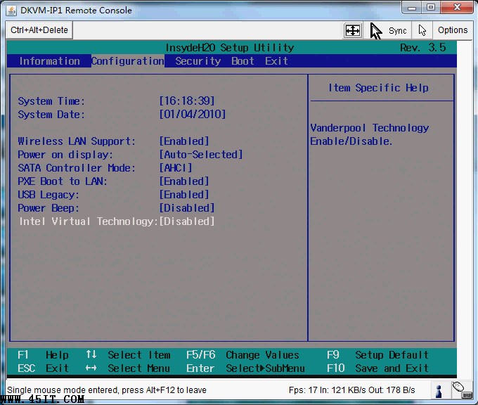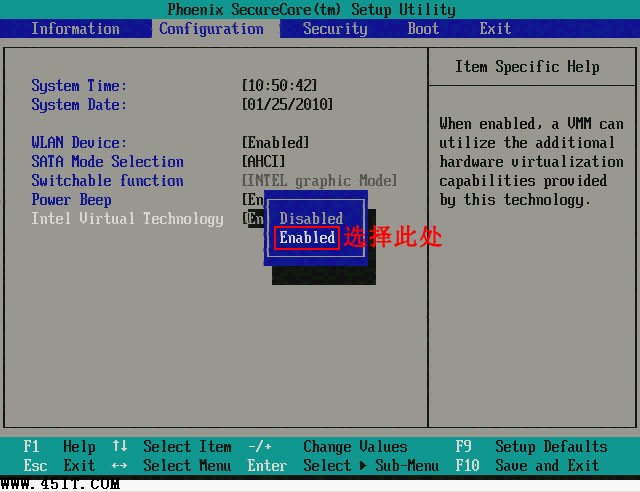 首先在開機自檢Logo處按F2熱鍵進入BIOS,選擇Configuration選項,選擇Intel Virtual Technology并回車,如下圖: