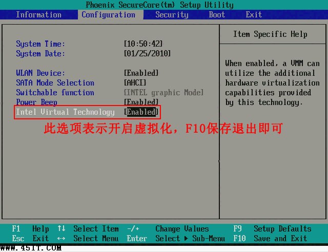 此時該選項將變為Enabled,最后按F10熱鍵保存并退出即可開啟VT功能,如下圖: