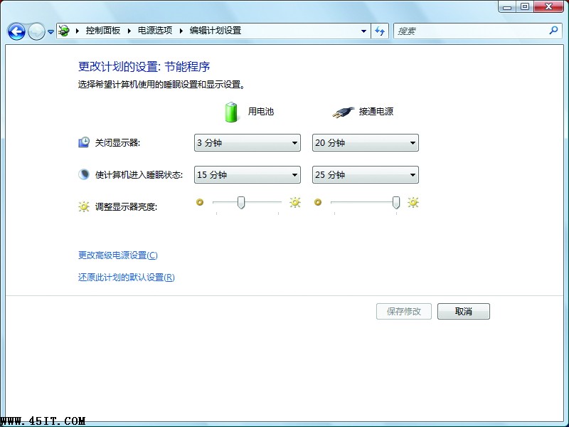 如果你的筆記本安裝的是Windows Vista系統(tǒng),設(shè)置則會有所不同。從“控制面板”打開“電源選項”后,我們可以為筆記本選擇“優(yōu)化(普通/平衡)模式”、“節(jié)能模式”和“高性能”模式,為了達(dá)到比較好的節(jié)電效果,我們推薦選擇“節(jié)能模式”(圖2),點擊選項下的“更改計劃設(shè)置”鏈接還可以自由定制關(guān)閉顯示屏和激活休眠的時間,同時還可以根據(jù)需要調(diào)整筆記本的屏幕亮度(圖3)。如果我們適當(dāng)?shù)貙⒛J(rèn)的時間減少,同時將亮度也調(diào)低則可以達(dá)到更好的省電效果。