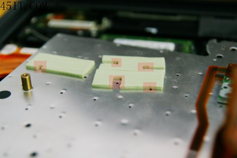 可以看到散熱器上的那塊導熱墊,確實已經老化,硬邦邦的 (為什么原裝的導熱墊要開孔,開槽,下文將會給出答案,這不是為了節省材料)