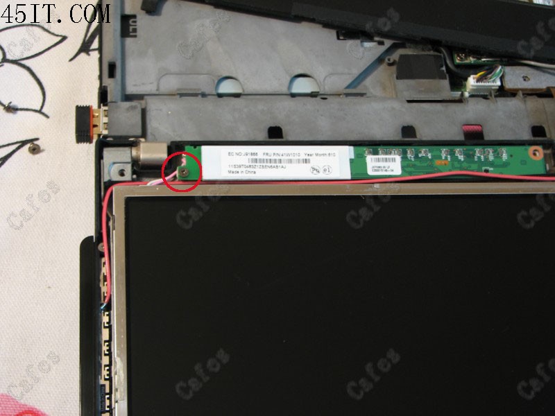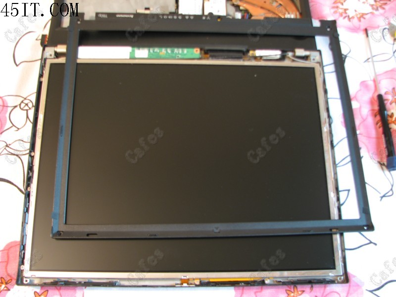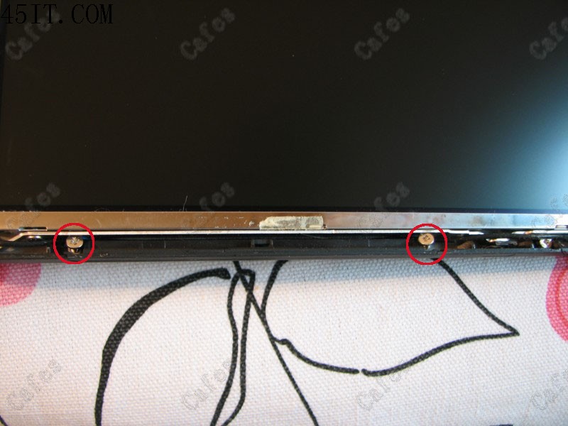 好了,拿起手邊的工具吧,這里你可能需要用到鑷子或者小刀片一類的東西了,下面的照片中Cafes圈出了幾個覆蓋有擋片的螺絲位,檔片可要小心的用鑷子刀片挑起來,要不裝回去的時候就不美觀了,礙乎面子的東西,可要慢工出細活咯,特別提醒一下,屏幕左側還有兩個必須擰下來的螺絲,要不擰,屏框是拆不下來的,在Cafes的照片里,我為了方便操作,把屏幕倒過來了,所以看上去像是在左邊的樣子,可別誤會了咯。