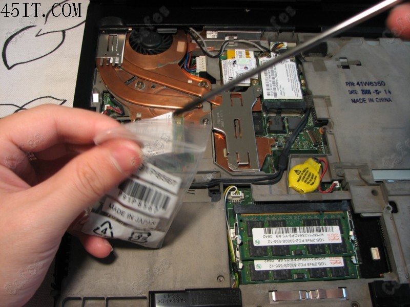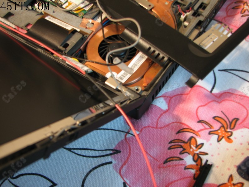 拆除前記得先要拆除電池哦,Cafes我是帶著防靜電環(右手藍色條)的,哈,安全第一,小時候拆機被靜電擊穿顯卡芯片的陰影還是揮之不去呢~~哈哈~